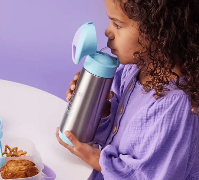 The front press button opening can be used with one hand to help with those big schoolyard thirsts and the integrated carry handle means it’s always on hand.