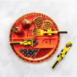 All products are manufactured using only FDA approved materials. The plate and utensils are BPA, Phthalate, PVC, Lead and Paint Free. Both the plate and the utensils are dishwasher and microwave safe.